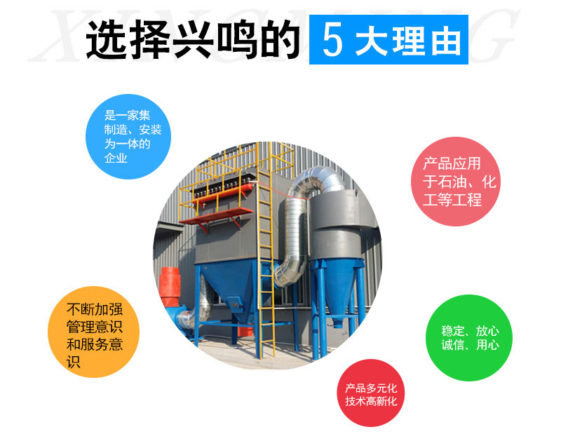 泊头兴鸣环保设备有限公司位于河北省沧州市泊头市四营乡杨屯村,是一家集设生产、制作、安装为一体的除尘器和除尘配件生产的现代化企业。是一家集研究、设计、制造、安装及售后服务为一体的企业。是目前国内环保产品及配套产品的生产基地。 我公司主营产品有:单机除尘器、布袋除尘器、脉冲除尘器、静电除尘器、旋风除尘器、滤筒除尘器、木工除尘器、除尘布袋、除尘骨架、电磁脉冲阀、UV光氧净化器、低温等离子净化器、光氧等离子一体机、焊烟净化器等系列产品。 公司是生产除尘设备及除尘配件产品的厂家。产品应用于石油、化工、电力、建筑等工程,深得用户好评。公司拥有检测手段和检测设备。公司不断加强管理意识和服务意识,不断拓展销售渠道,并准建立了从设计、生产、安装和服务的质量模式。公司确定的“重技术、以质取胜,为用户着想”为企业立足点和出发点。加大技术投入和技术人才引进,依托优良的设备、完善的工艺、规范的质量管理为客户打造质量优良的除尘设备,为节能减排贡献出自己的一份力量。泊头兴鸣环保设备有限公司的发展凝聚着各界朋友的关心和厚爱,凝聚着客户的信赖与支持,我们将不负众望,发挥整体优势,向产品多元化、技术格新化、体制现代化、效益规模化发展。